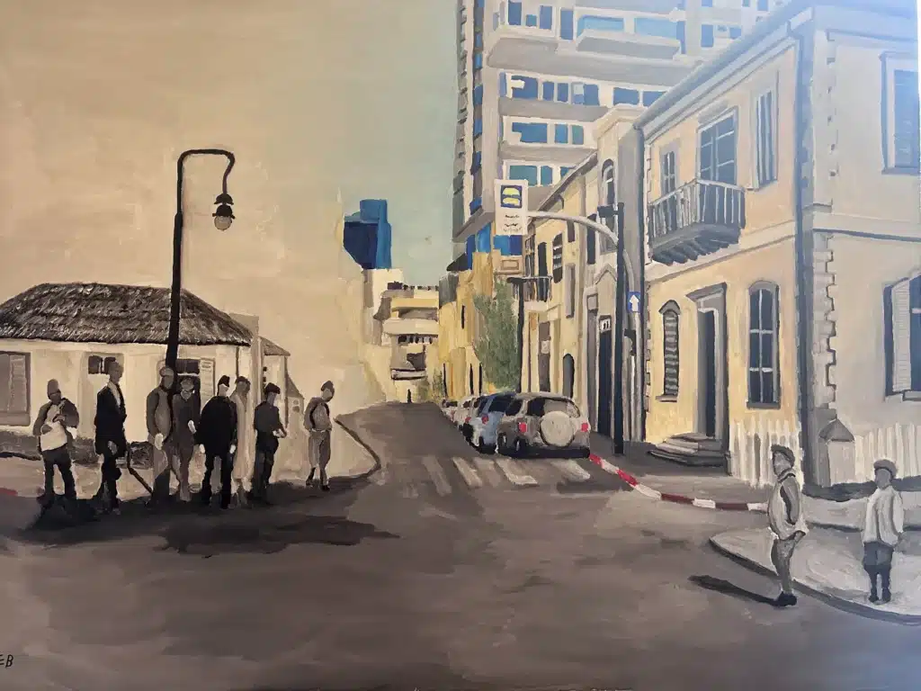 זוהי היצירה השלישית בסדרת “תל אביב אז והיום”, והיא חוזרת אל הרחוב הראשון – רחוב אחד העם. אם בציורים הקודמים התמקדתי בארכיטקטורה, כאן אני מתמקד באנשים. בנשמות. בצד שמאל של הקנבס, מתוך גווני הספיה והאפור, מגיחים הם – אנשי החזון. הדמויות הכהות, לבושות בחליפות ובכובעים של פעם, נראות כאילו יצאו הרגע מ”הגרלת הצדפים”. הם עומדים שם, קבוצה של צללים חיים, ומביטים אל עבר העתיד שיצרו במו ידיהם.